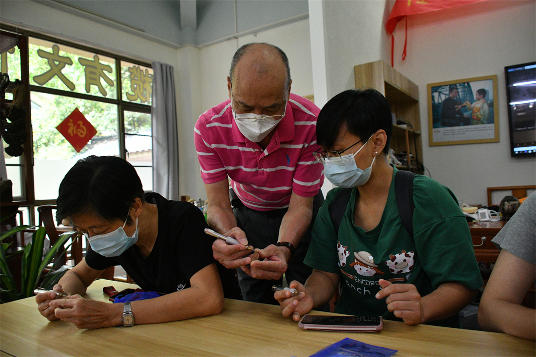 赏作品、品乌榄、巧雕刻......走进榄雕研学传承基地,青年社会组织成员间交流密切,场面热闹非凡。非遗“广州榄雕”项目国家级代表性传承人曾昭鸿先生现场演示起榄雕的技法,并讲解了如何用锉刀在榄核上打磨、抛光等。大部分社会组织成员表示都是初次体验“广府榄雕”非遗技艺,切身感受非遗传统文化。“可以近距离了解广州榄雕,并且收获了属于自己亲手雕刻的榄雕作品,感谢市青年宫组织的伙伴日活动。”来自广州市和众泽益志愿服务中心的子杨这样说道。